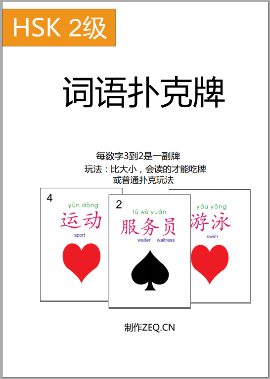 文件名:HSK2级扑克牌 52页 HSK一级每页4张
