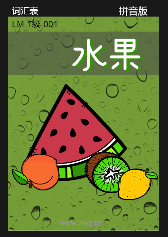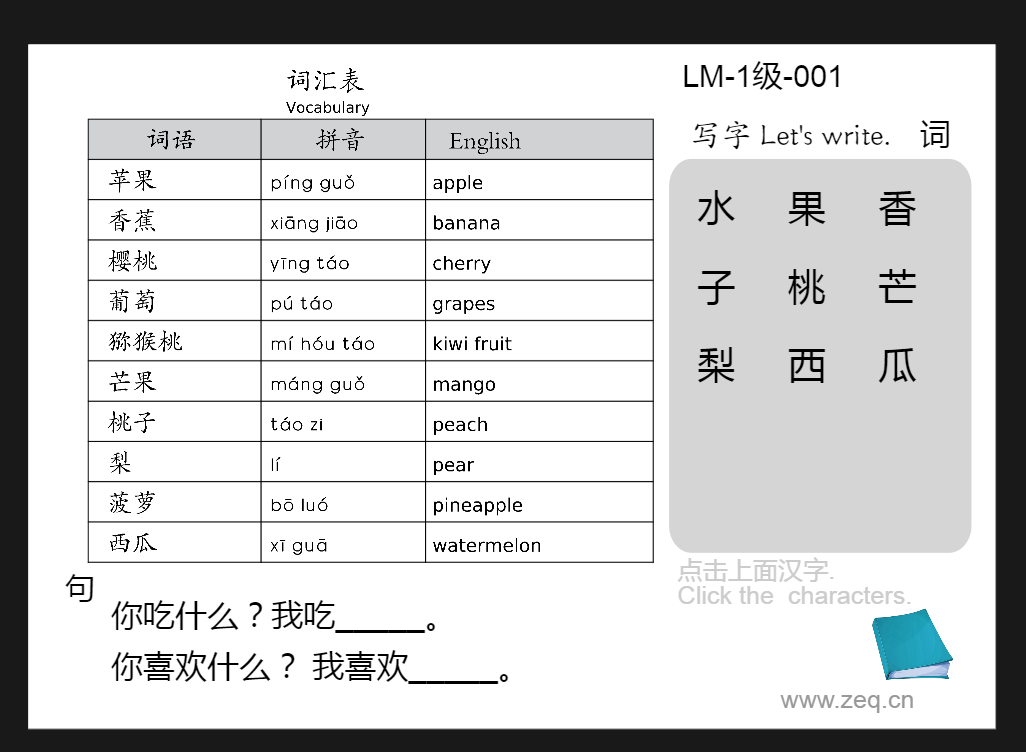文件名:主题课件:水果-Fruit-LM-1级-001 作者其他作品列表 本站价格:0.9元 支付宝购买并马上下载 如果该文件是H5,大部分H5资源得到的是网址 TPT链接:点此购买 谷哥网盘:有 百度网盘:有 文件大小:8.8 MB(可能) 文件页数:1 页 (可能) 说明:本商品是电子文件形式发送,拍下留邮箱。 本主题课件包括 H5文件和EXE可运行文件两种。 H5文件可以用Chrome打开,EXE文件可以双击打开。 主题:水果 词汇: 苹果|香蕉|樱桃|葡萄|猕猴桃|芒果|桃子|梨|菠萝|西瓜 你吃什么?|我吃_____。|你喜欢什么? |我喜欢_____。 apple^banana^cherry^grapes^kiwi fruit^ mango^peach^pear^pineapple^watermelon ![]() ![]() ![]() |